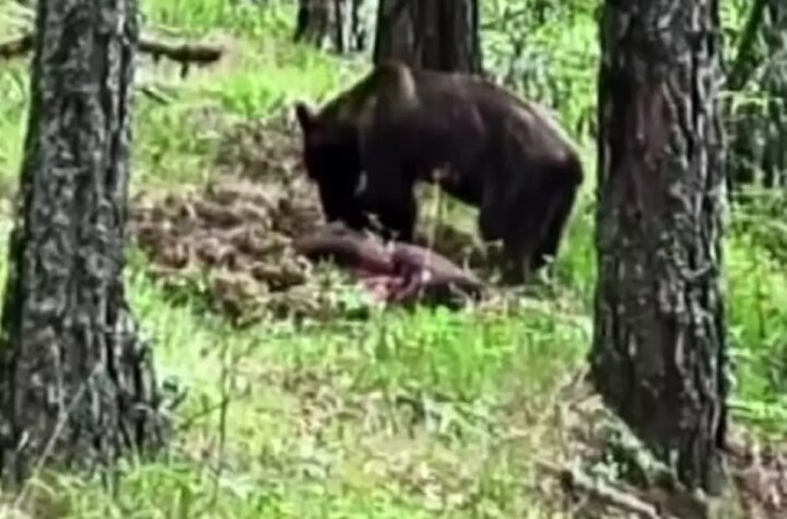 Kastamonu'nun Daday ilçesinde mantar toplarken ayının avladığı domuzu gömüp yemesini cep telefonuyla görüntüleyen Anahtar...